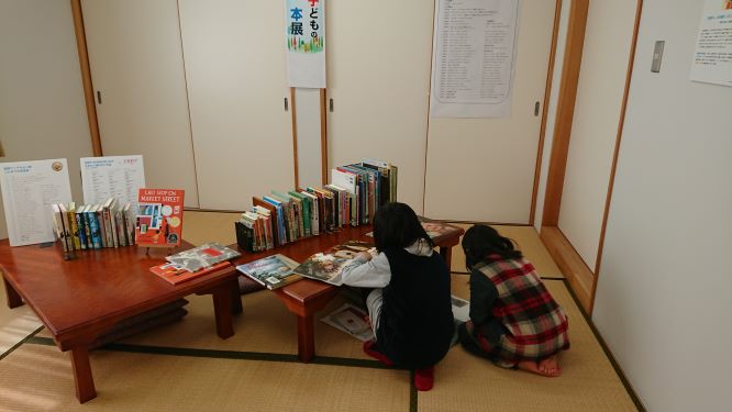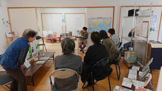 市営団地と町内の集会室を兼ねる展示本のならぶ会場は、10数名の皆さまがご一緒下さるといい雰囲気が生まれます。それぞれ自分の時間を楽しんで下さるなかで、ここちよい「図書室」になります。本のあるこのシンプルな空間。61か国と地域の、世界の言葉(50言語)が静かに行き交って。