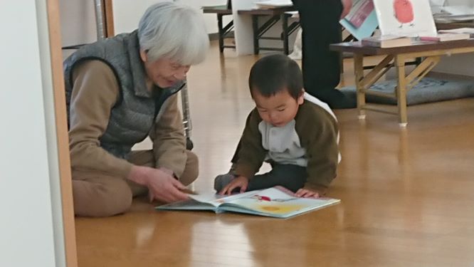 畳の間では、ほんとのおばあちゃんの読む本にぴったり寄り添って「あめだま」(ペク・ヒナ作)を楽しむ姿。ここでは自然に多世代の交流が生まれます。これぞ集会所図書室!